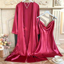Damen Zweiteiliges Seidiges Satin-Pyjama-Set Spitzen-Nachthemd mit Morgenmantel Schlafanzug für Frühling und Herbst